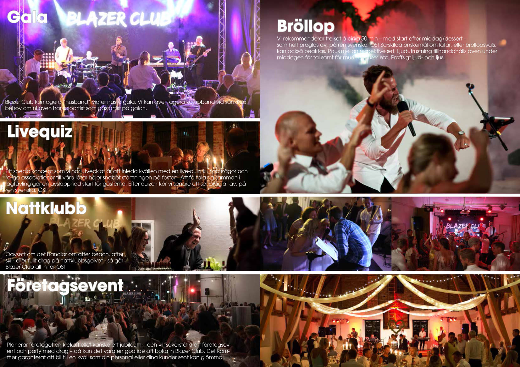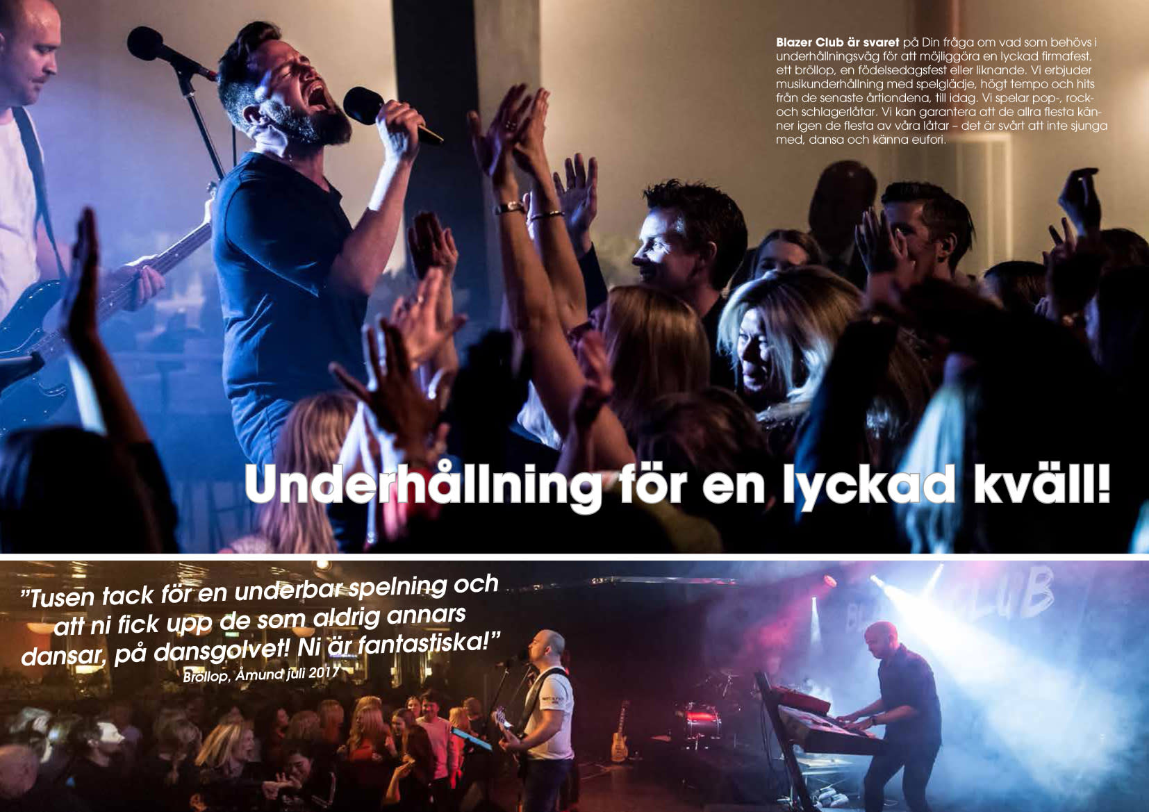 Om du vill att festen ska vara en magisk och minnesvärd upplevelse, behöver du inte leta längre. Blazer Club tar hand om allt; resa, profesionell ljus- och ljudutrustning ingår alltid i pris för liveshow. Fasta priser inom såväl Stockholmsområdet, Göteborg som Malmö. Så låt oss tillsammans skapa minnen som varar livet ut. Besök vår hemsida för mer information, kontrollera vår tillgänglighet och boka oss redan idag. Succén är bara ett samtal eller mail bort med Blazer Club!
