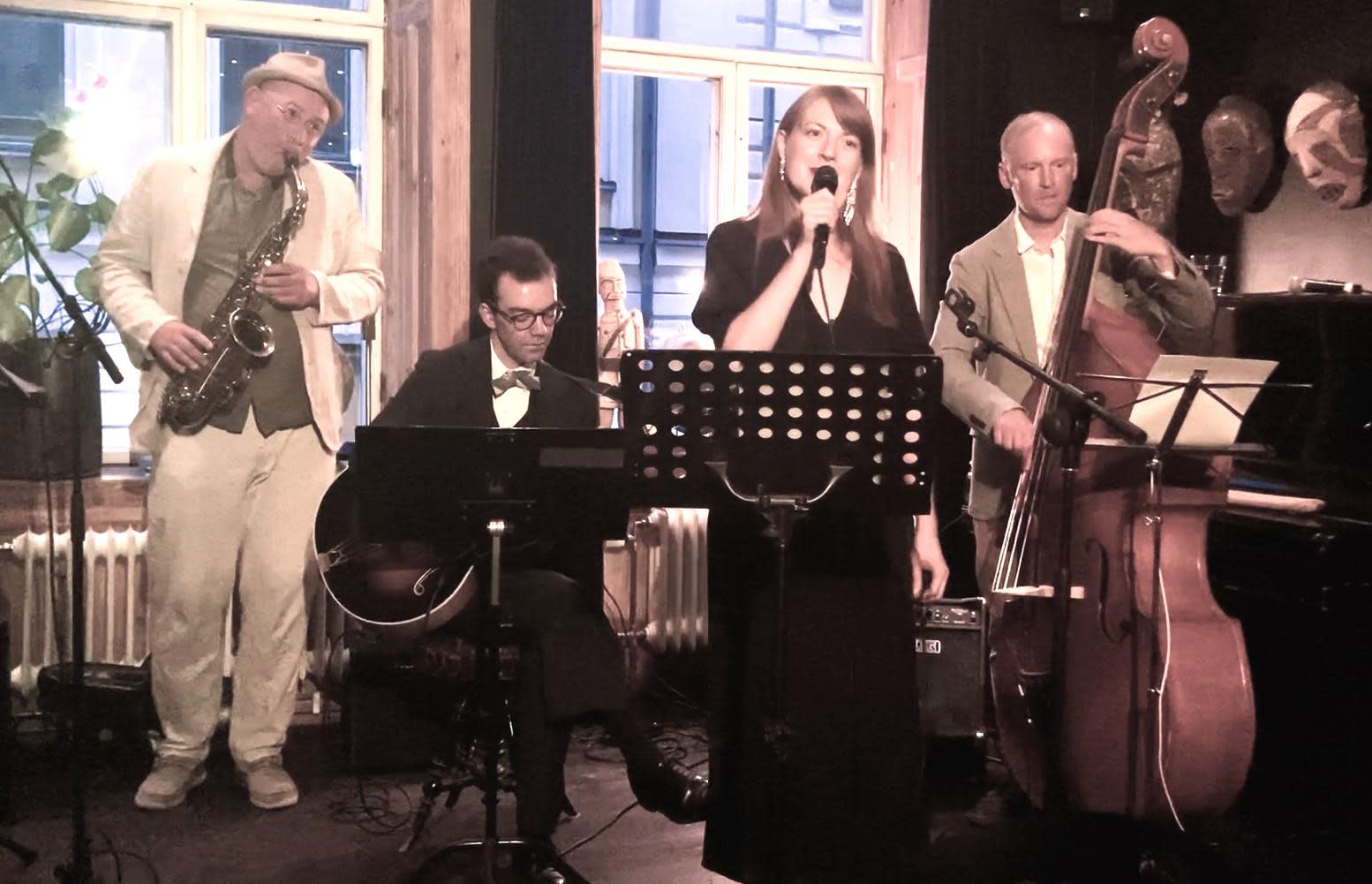 Swing och 30-tals glamour! Blue Moon erbjuder en tidsresa, och underhåller till mingel, fest och dans. Vi är en kvartett bestående av franska sångerskan Adèle Bel, Yann Le Nestour, sång och saxofon, Samuli Latvajärvi, gitarr och Arvid Pettersson, kontrabas.