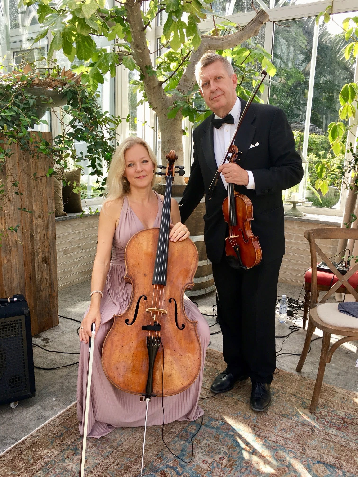 Violin- och celloduo som spelar vid bröllop, mingel, fester, middagar, events, konserter, dop, begravningar, ceremonier m m.