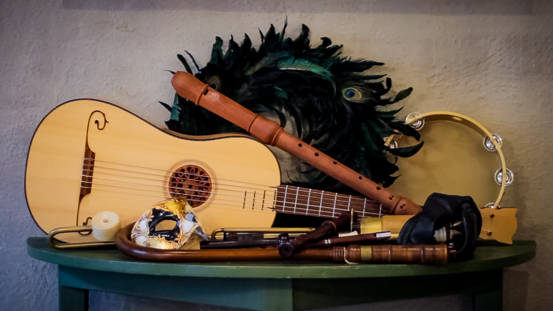Barockgitarrer, krumhorn, olika flöjter, säckpipor, slagverk, sång, luta.