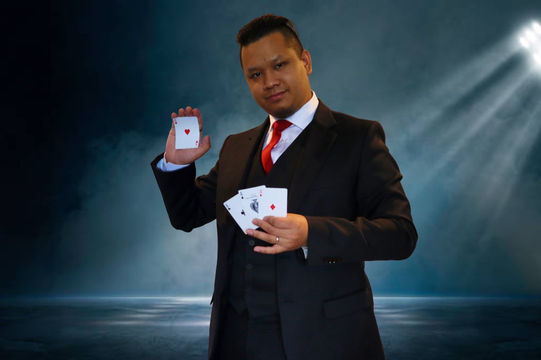 "Bakom varje kort döljer en berättelse. Jag ska visa er vad som gömmer sig bakom kulisserna — Där magi och fusk kommer samman. Sleight of hand/fingerfärdighet. Inga gimmicks. Utan ren kortmagi"