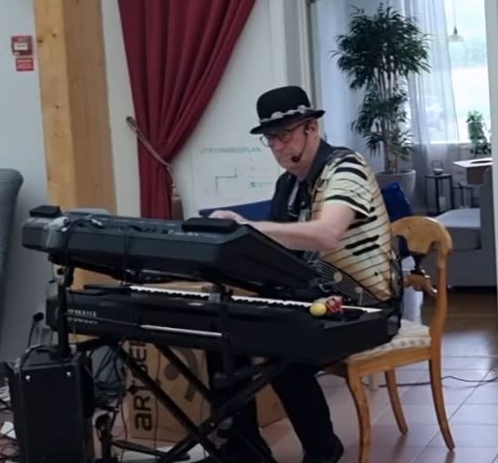 Spelar allt själv , splittar ofta pianot får elbas i vänsterhanden och piano på högerhand , Trumma med foten , keybord på toppen orgel samt ibland trummaskin , ibland ”backingstyles”