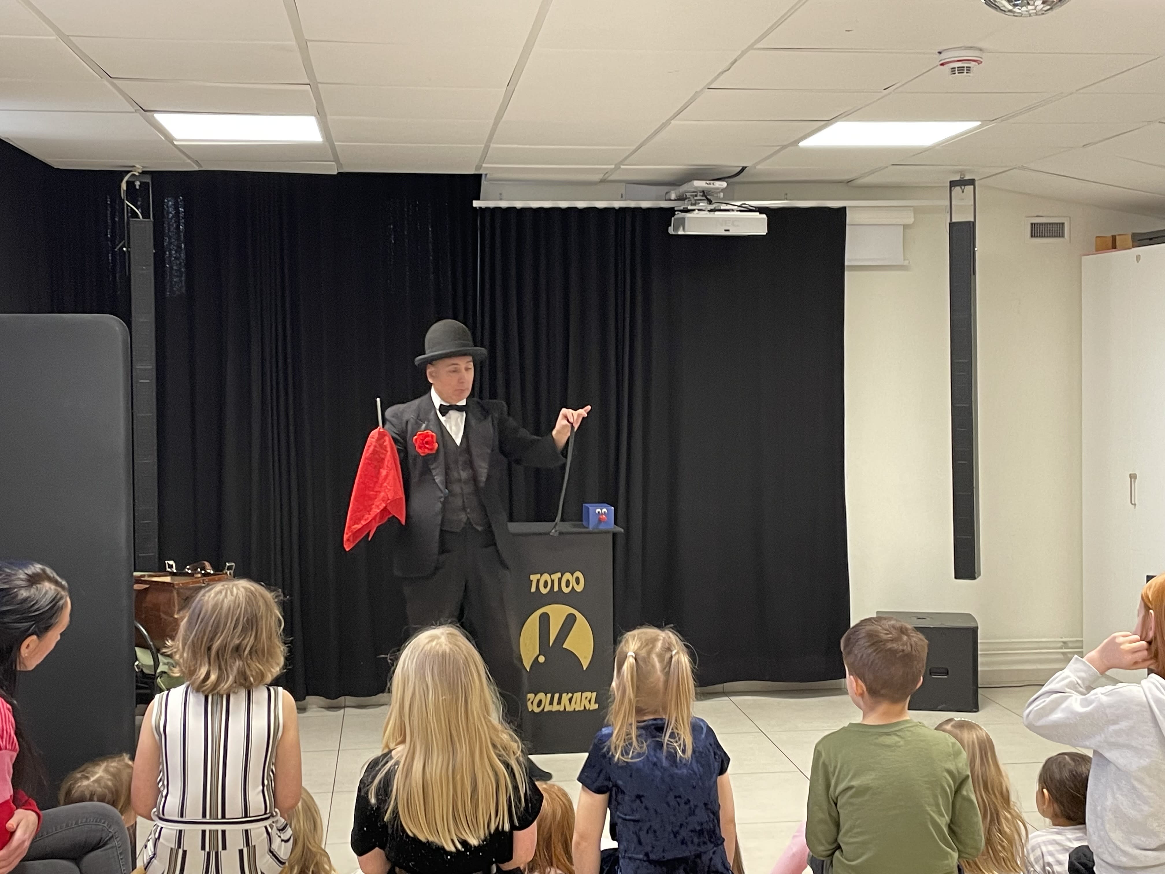 Jag brukar alltid be någon från publiken komma fram och hjälpa mig. Oftast är det födelsedagsbarnet men det kan också vara fler som får hjälpa till.